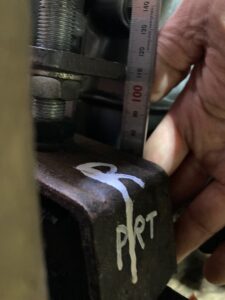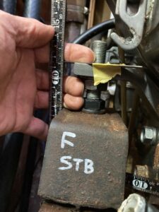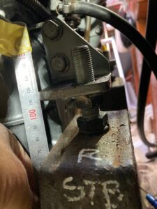 下の写真はエンジンマウント上端とエンジンベッドの木板上端間の距離備忘録です。これで整備後に新品エンジンマウント載せ替えたあとも芯出しが少しは楽なはずです。
