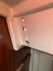 チェーンプレートも6個外しました。来週、入手予定の日油のカラーチェックで検査してみます。部分的ではありますが錆びてます チェーンプレートも現在のよりも厚くて面積が大きいものに交換せねば。 プレートのうち1個の下側がドッグハウスに干渉していたためキャビン内に小さなヒビも発見したので、確認して必要に応じてFRP積層して強度を増す予定です。