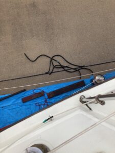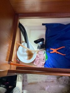 そのあと、清水タンクも撤去、給水用ホースや排水用ホースも、今回の外洋航海では使わない予定なので切り取り外しました。水ホースはかなり硬化していたので 刃があえて鋭くない銅線を傷めずに被覆を取るための電工ナイフでは このホースは全く切れないのでノコギリで切りとってはずしました。なお、水タンクはラバーバッグタイプのものだったので ぴったりしている飛行機の翼と違って私のヨットバース(ベッド)の下はスペースに余裕がありすぎて 外洋では水が入ったまま暴れるスペースとなるので水漏れの危険大と判断してまずは取り外すことにしました。代わりに12リットルの給水ポリタンク群と軽油携行缶群を 船底近くに木枠とFRPで固縛し、ヨットの床自体を上げてキャビンのほとんどは座敷にしてみようと思ってます。
