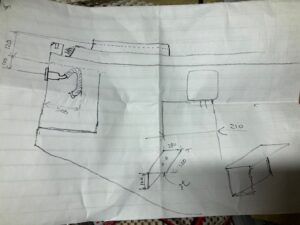 しかし、その出来栄えがあまりにも悪かったのでその友人がプラダンの型取りからすべて手本を見せてくれました。それがこの写真のです。材料は12mmの合板です。脚部分には転がっていた角材で補強しています。