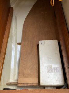 まずは、クォーターバースのクッションと備え付けの床板を撤去。これで座った状態で頭もあたらない程度の空間ができるのです。しかし、この艇にはFRPのつるつるのインナーハルがあるためにそのままだとハルの曲線で、私の加齢とともにより硬くなった足首や指先関節は少しの傾斜でも音を上げてしまいます。すぐにとても苦しい体勢となり作業が何もできないのです。これまでは使わない救命胴衣をテキトーに10枚ぐらい順番にならべて水平面を作っていました。救命胴衣の材質のおかげで ひざは痛くなかったですが救命胴衣自体が滑るので作業するにはやはり無理がありました。そこで今後のエンジンやスタッフィングボックスの整備性を上げるためにも床製作をと友人のアドバイスをいただき、製作してみました。