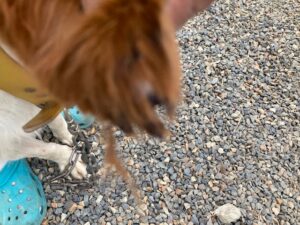 (活発すぎるテンをおとなしく怪我回復させるのには ヨットのアンカー用に予備で持っていた鎖とシャックルとより戻しを活用。陸地にボートも係留できる3本杭でとめる黄色い金具に取り付けて中庭で 極力安静にさせています。)