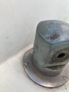 下の写真はティラーを外して、ティラーの柄の接続金具を 温風ヒーターで350度まで温めて硬いボルトを抜いて取り除きました。 そこまでは順調だったのですが。。。。